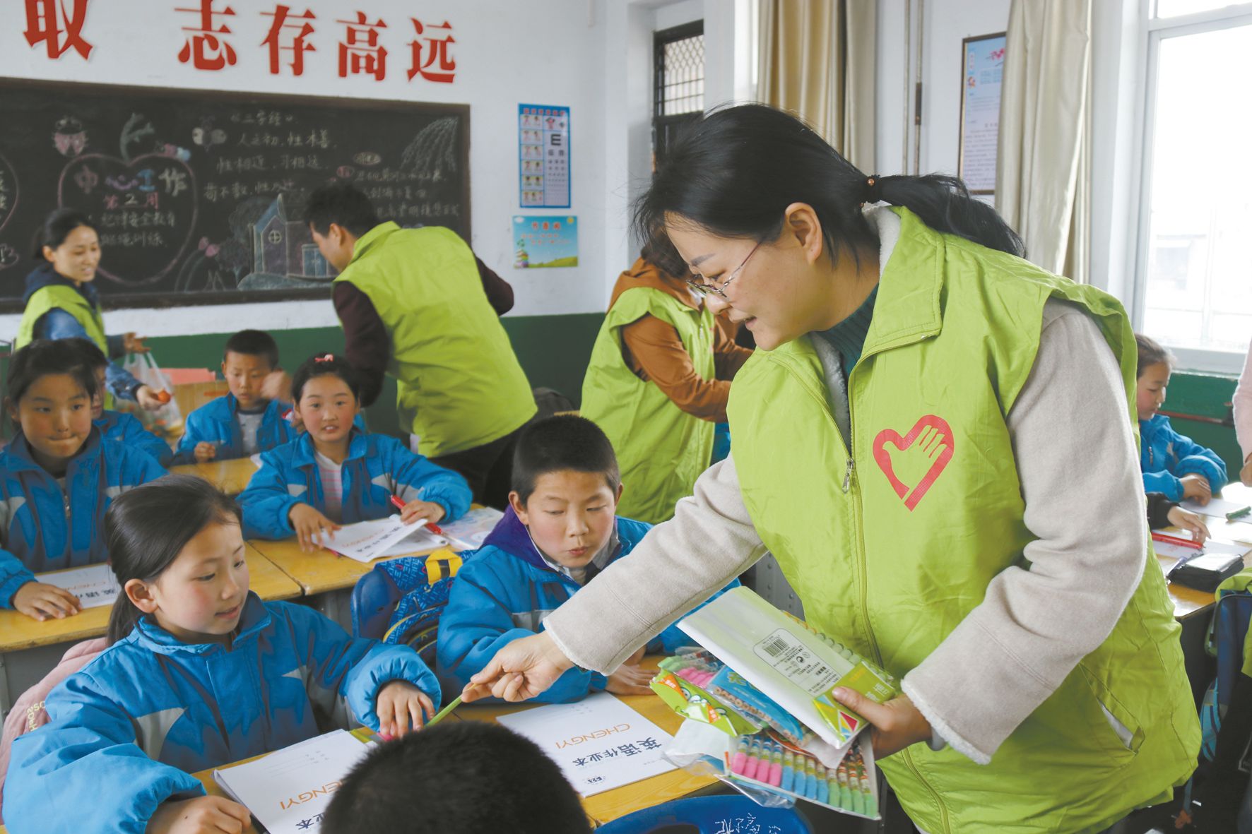 圖為誌願者正在給留守兒童發放學習用品。(趙婧 攝)