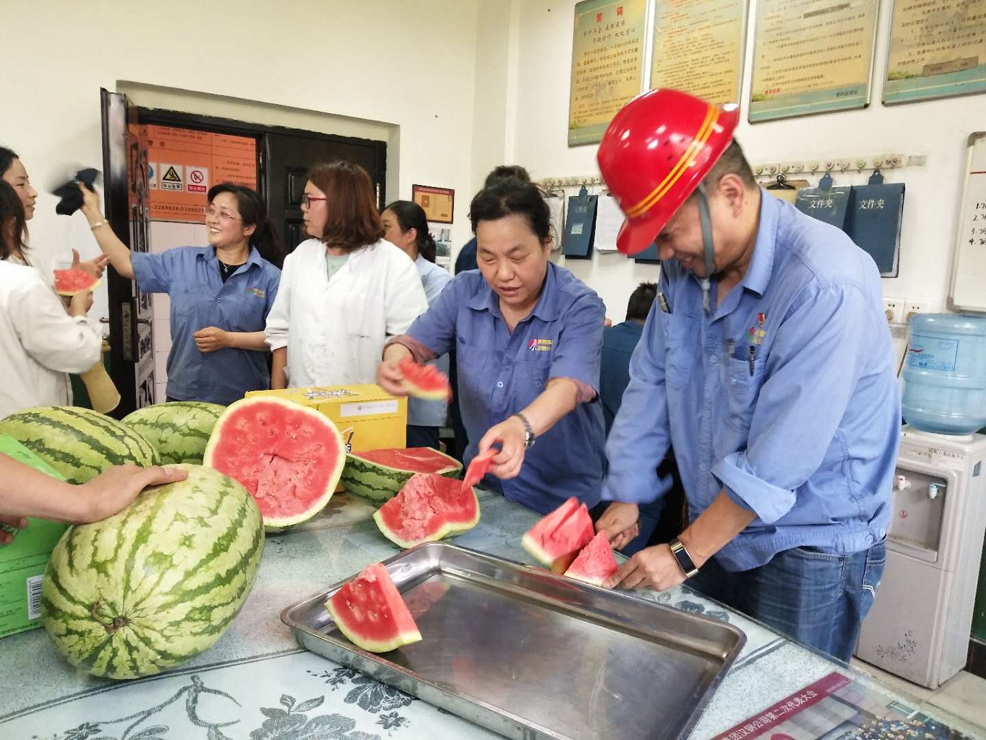 “赤日滿天地,火雲成山嶽”,隨sui著zhe氣qi溫wen的de逐zhu漸jian升sheng高gao,職zhi工gong的de身shen心xin健jian康kang牽qian動dong著zhe各ge級ji組zu織zhi的de心xin,為wei做zuo好hao高gao溫wen天tian氣qi職zhi工gong防fang暑shu降jiang溫wen工gong作zuo,切qie實shi保bao障zhang廣guang大da職zhi工gong的de身shen體ti健jian康kang,維wei護hu廣guang大da職zhi工gong的de根gen本ben利li益yi,7月23日,陝鋼集團漢鋼公司工會開展了“夏送清涼”慰問活動,將精心準備的西瓜配送到每一位職工的手中,將公司的關心、關愛傳遞到職工的心中,使職工在高溫酷暑季節裏感受到組織的絲絲“清涼”。