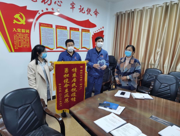 近jin日ri,江jiang西xi新xin鋼gang街jie道dao辦ban鐵tie山shan社she區qu領ling導dao前qian往wang新xin餘yu鋼gang鐵tie集ji團tuan有you限xian公gong司si動dong力li廠chang裏li贈zeng送song錦jin旗qi,感gan謝xie該gai廠chang領ling導dao及ji廠chang誌zhi願yuan者zhe對dui鐵tie山shan小xiao區qu疫yi情qing防fang護hu工gong作zuo的de大da力li支zhi持chi和he無wu私si幫bang助zhu。疫yi情qing期qi間jian該gai廠chang派pai遣qian20餘名誌願者晝夜輪流值守小區加強進出人員管理。