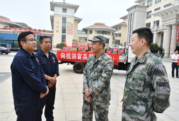 7月15日,方大九鋼董事長顏建新、黨委書記徐向陽率隊,到馳援湖口的東陸第72集團軍相關部隊駐地進行慰問,主動為官兵送去了1200份牙膏、牙刷、毛巾、沐浴露等生活物資以及麵包、水等1200份幹糧,價值3萬餘元。