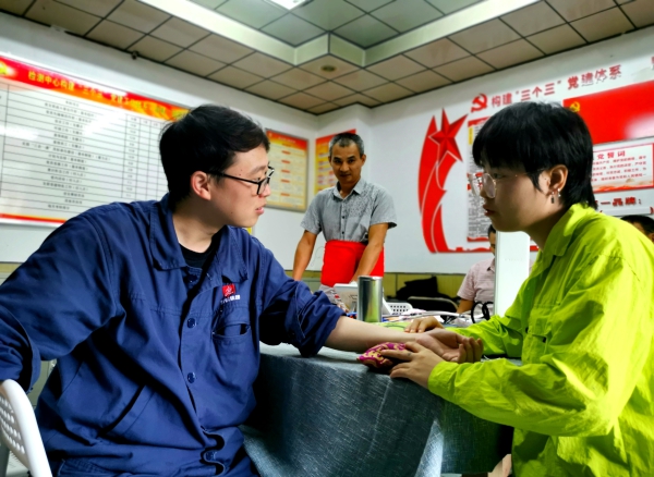 體內有濕氣,怎麼調理? 不要熬夜,禁食生、冷、辛辣、刺激食物,注意休息,加強鍛煉,身體就會慢慢好起來的!”日(ri)前(qian),新(xin)餘(yu)鋼(gang)鐵(tie)集(ji)團(tuan)有(you)限(xian)公(gong)司(si)檢(jian)測(ce)中(zhong)心(xin)工(gong)會(hui)邀(yao)請(qing)來(lai)自(zi)中(zhong)醫(yi)學(xue)院(yuan)的(de)青(qing)年(nian)誌(zhi)願(yuan)者(zhe),為(wei)一(yi)線(xian)職(zhi)工(gong)進(jin)行(xing)中(zhong)醫(yi)把(ba)脈(mai),針(zhen)灸(jiu)理(li)療(liao),拔(ba)罐(guan),按(an)摩(mo)等(deng)健(jian)康(kang)義(yi)務(wu)服(fu)務(wu)活(huo)動(dong)。圖(tu)為(wei)青(qing)年(nian)誌(zhi)願(yuan)者(zhe)在(zai)為(wei)職(zhi)工(gong)中(zhong)醫(yi)把(ba)脈(mai)時(shi)情(qing)景(jing)。(通訊員:張俊 曾晴攝)