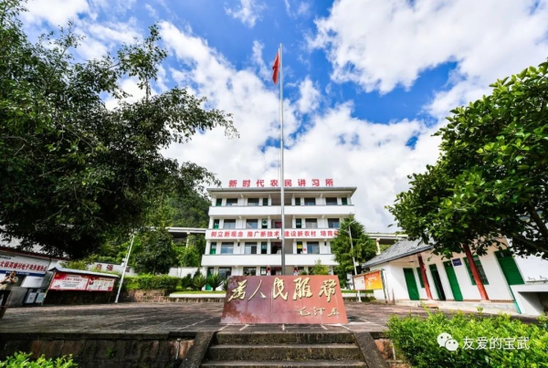 鎮沅縣以東、無量山深處,猛大鎮英德村,有一個農民技術學校。學校建在群山之中的一個壩子上。拾階而上,迎麵是一個鐫刻“為人民服務”題字的台座,五星紅旗迎風招展,正對著一座嶄新的4層校舍樓頂上“新時代農民講習所”八個紅色大字,分外顯眼奪目。
