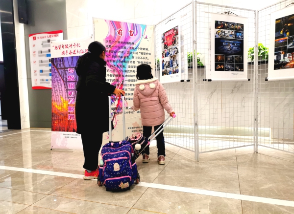 圖為職工家屬駐足觀看攝影展時情景。(張俊攝)