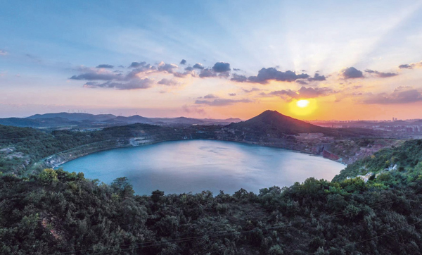昔日凹山采場(上圖)變成美麗的人工湖(下圖)。 (冷天馳 呂方清 攝)