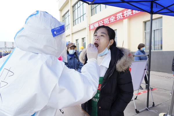 1月14日,新餘鋼鐵集團有限公司全員核酸檢測模擬演練在該公司綜合原料主控樓下舉行,演練曆時1小時,共完成樣本采集量400份。由於前期工作準備充分,在多個檢測點,每名職工一份核酸檢測標本采集時間僅需30秒。圖為職工正在接受核酸檢測。 (特約通訊員 歐陽斯娟 攝)