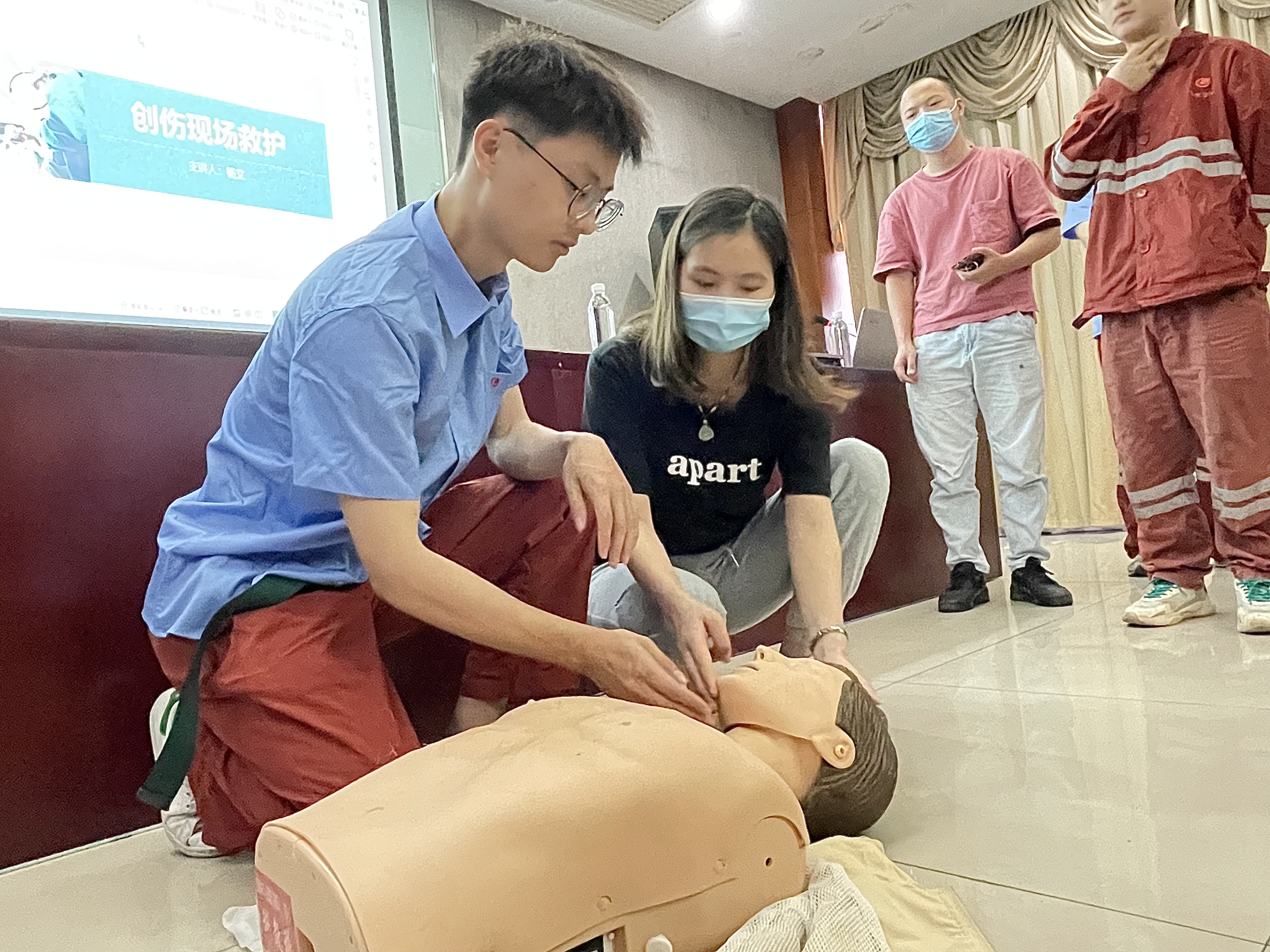 此次培訓內容包括急救包紮、心肺複蘇、氣道異物梗阻急救、AEDshiyongdengxiangguanjichuzhishi,jiyixiejiandanyouxiaodechuangshangjiuhujineng,zhizaicujinzhigongduijijiuzhishidelejie,duishengchanshenghuozhongyudaodetufaqingkuangheyiwaishanghainenggoujinxingjiandanyouxiaodeyingjichuli,weiyiliaojigoushishiqiangjiuyingdeshijian,baohuzhigongqunzhongshengminganquan。laizilianganggeerjidanweide30餘名青年職工參加了培訓。
