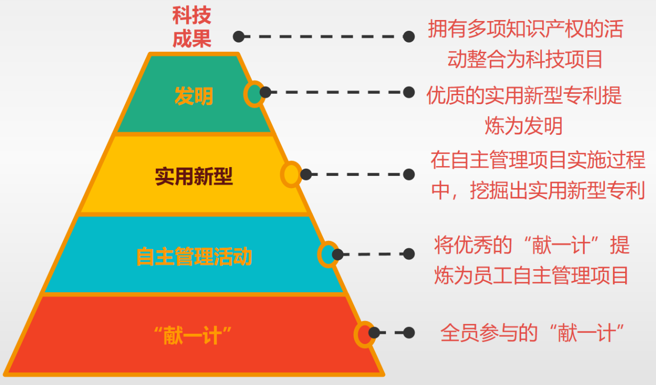沒有製度的創新就如同無源之水,黨支部組織骨幹認真解析公司創新方麵的製度辦法,形成了黨支部創新“金字塔”,第一層以“獻一計”活動為載體,引導員工立足崗位積極獻計;第二層將獻計轉化為員工自主管理項目,推進員工獻計有效實施;第三層注重實施成果的提煉和挖掘,形成知識產權;第四層將要優質的實用新型專利提煉為發明;最後一層將擁有多項知識產權的活動整合為科技項目。