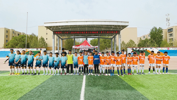 圖為塔縣小學足球隊和對手球隊在2024年喀什地區青少年足球錦標賽賽場上合影。