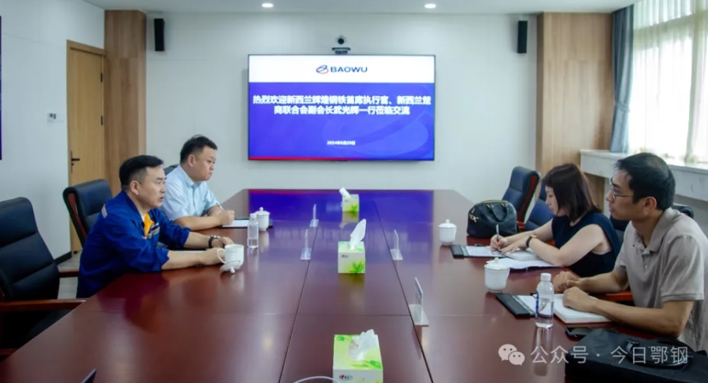 8月29日,新西蘭楚商聯合會副會長武光輝一行來訪。鄂城鋼鐵公司高級副總裁(主持工作)黃大軍熱情接待。武光輝一行查看了鄂鋼產品實物質量,現場感受鄂鋼智慧製造、綠色製造。座談中,雙方就開展鋼材外貿合作深入交流,就建立長期合作關係達成共識。