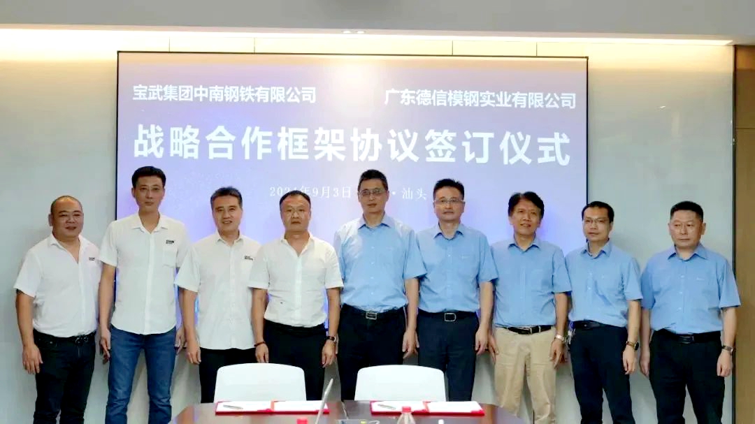 9月3日,中南鋼鐵與德信模鋼在汕頭簽訂戰略合作協議,雙方將在中厚板品種的供應和服務、技術研發及供應鏈延伸等方麵開展深度合作,促進雙方共同發展,共同構建鋼鐵供應鏈生態圈。