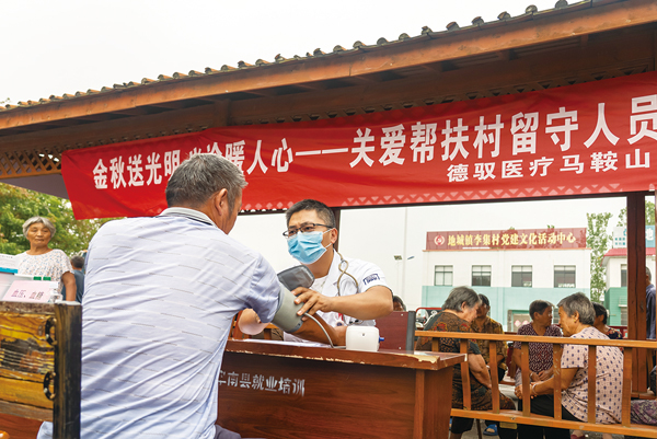 圖為馬鞍山總醫院醫生正在為定點幫扶村的老人測量血壓。