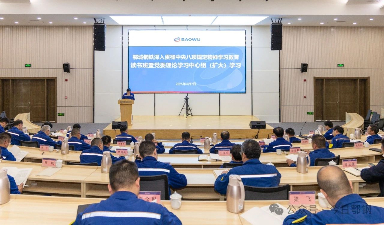 4月7日,鄂城鋼鐵公司舉辦領導人員深入貫徹中央八項規定精神學習教育讀書班暨黨委理論學習中心組(擴大)學習,學習領會、貫徹落實中央八項規定及其實施細則精神,運用由風及腐案例加強警示教育,引導黨員、幹部錘煉黨性修養、提高思想覺悟、加強作風建設,永葆黨的先進性純潔性,為持續打造綠色智慧高效美麗的新鄂鋼提供作風保障。