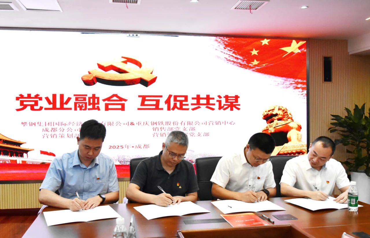 近日,重慶鋼鐵營銷中心銷售部、營銷管理部與攀鋼國貿成都分公司、營銷策劃部聯合開展了以“黨業融合•互促共謀”為主題的四方黨支部共建活動。重慶鋼鐵高級副總裁謝超,副總裁兼營銷中心黨總支書記、總經理章遠傑,攀鋼國貿黨委書記、董事杜健,黨委副書記、總經理蒲禮國等出席共建活動。