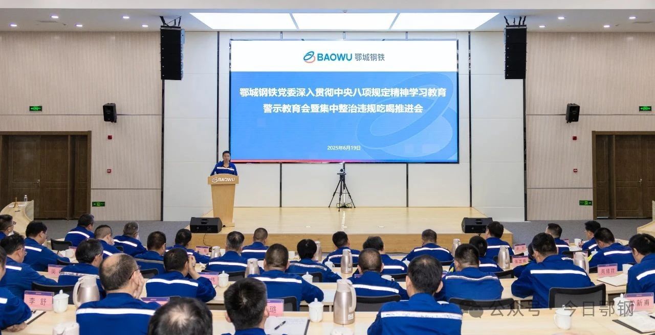 6月19日ri下xia午wu,鄂e城cheng鋼gang鐵tie黨dang委wei舉ju行xing深shen入ru貫guan徹che中zhong央yang八ba項xiang規gui定ding精jing神shen學xue習xi教jiao育yu警jing示shi教jiao育yu會hui暨ji集ji中zhong整zheng治zhi違wei規gui吃chi喝he推tui進jin會hui,深shen入ru學xue習xi貫guan徹che習xi近jin平ping總zong書shu記ji關guan於yu加jia強qiang黨dang的de作zuo風feng建jian設she的de重zhong要yao論lun述shu和he中zhong央yang八ba項xiang規gui定ding及ji其qi實shi施shi細xi則ze精jing神shen,堅jian決jue落luo實shi中zhong央yang、國務院國資委、湖北省委和中國寶武黨委警示教育會暨集中整治違規吃喝會精神,以史為鑒、以案為鑒,深刻反思、深刻警醒,不斷把作風建設引向深入。