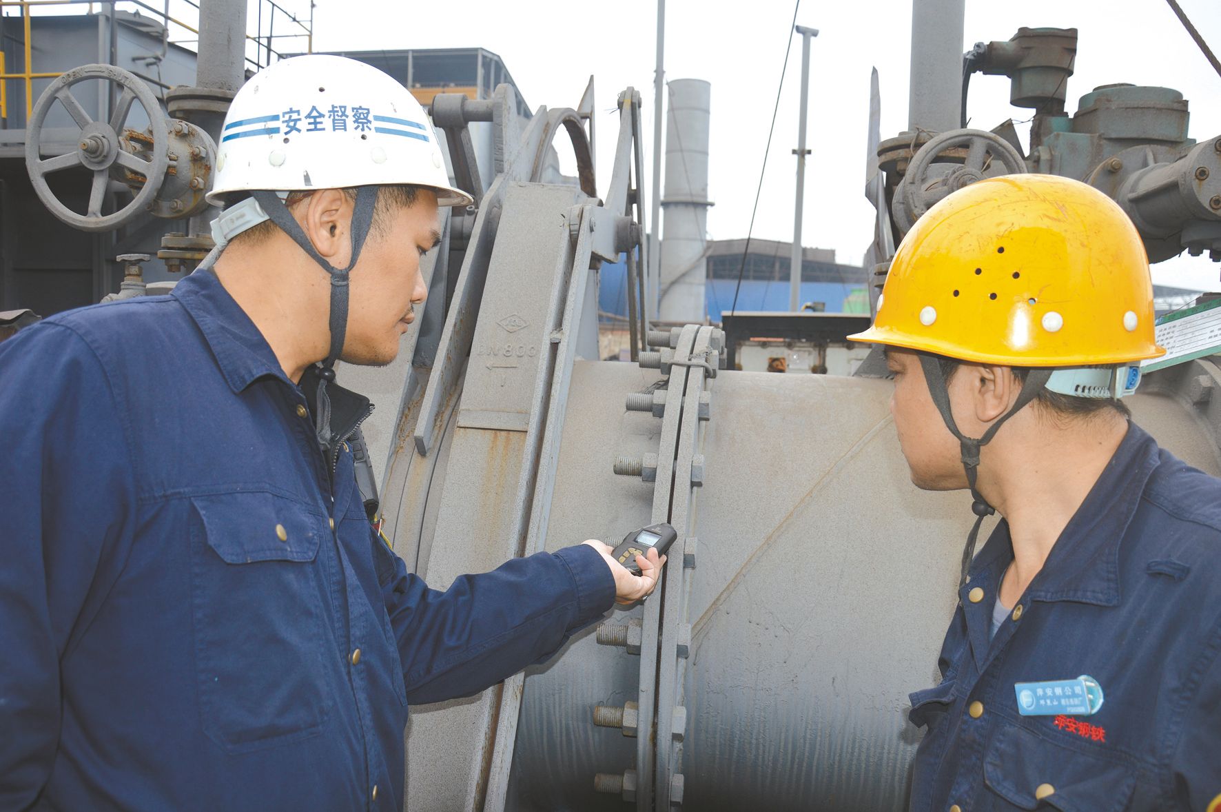圖為方大萍安鋼鐵湘東煉鋼廠安全員葉海(左)正在與職工檢查煤氣電動眼鏡閥。 (彭雲桃 供圖)