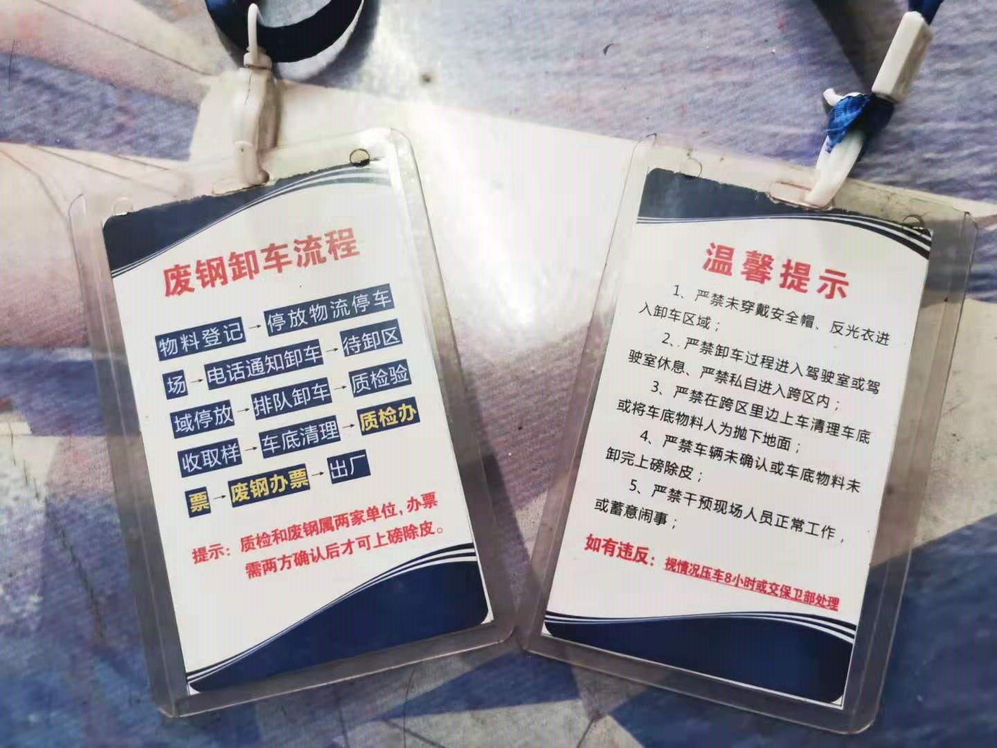 近jin日ri裏li,廢fei鋼gang區qu域yu進jin來lai的de外wai來lai司si機ji朋peng友you胸xiong前qian都dou掛gua上shang了le一yi張zhang小xiao卡ka片pian,卡ka的de正zheng麵mian是shi廢fei鋼gang卸xie車che流liu程cheng圖tu,能neng讓rang司si機ji朋peng友you很hen明ming確que的de了le解jie到dao自zi己ji的de車che輛liang處chu於yu廢fei鋼gang卸xie車che驗yan收shou的de哪na個ge階jie段duan;背麵是現場安全提示,上麵詳細的標識了廢鋼作業現場的安全風險、注意事項,提醒司機朋友進入卸車現場後如何確保自身安全。