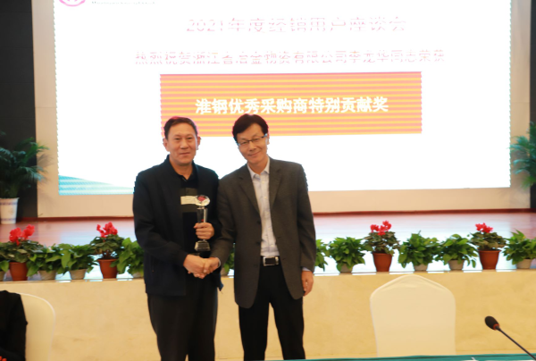 為感謝浙江省冶金物資有限公司23年來的信任與合作,蔣建平代表淮鋼,授予該公司原銷售經理李龍華同誌“淮鋼優秀采購商特別貢獻獎”。