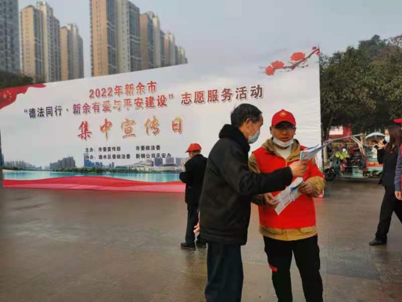 3月5日上午,新鋼公司與市委宣傳部、市委政法委、渝水區委政法委聯合在抱石公園開展了平安建設主題集中宣傳日活動,來自公司武裝保衛部、軋鋼廠、動力廠、檢測中心等單位的平安誌願者積極參與現場平安宣傳誌願服務活動。
