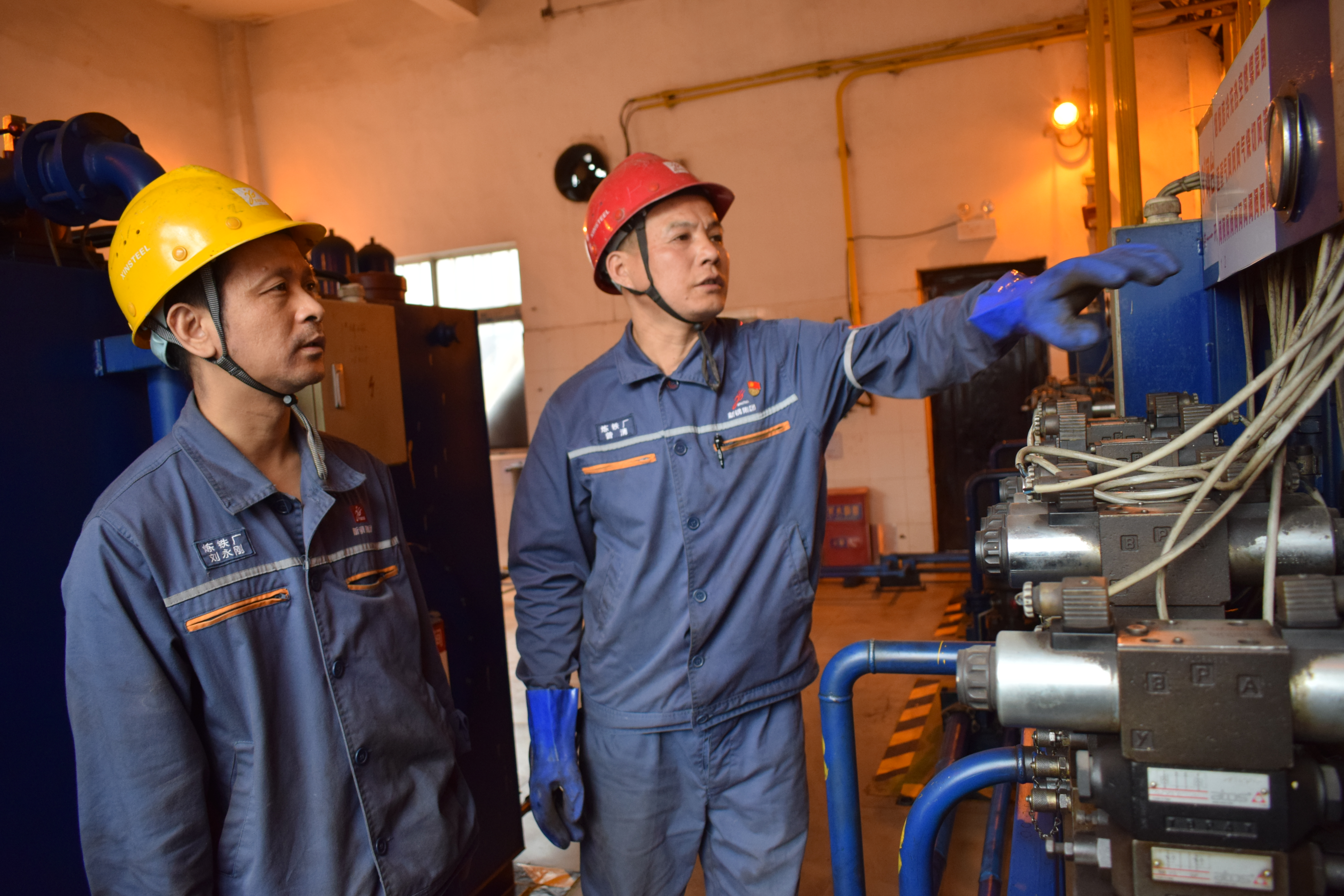 自新鋼公司縱深推進“雙基管理”以來,新餘鋼鐵股份有限公司煉鐵廠以夯實雙基管理為契機,全麵向設備和工藝中“跑冒滴漏”宣戰,從精細化操作入手,像愛護眼睛一樣愛護設備,重點加強對各液壓站設備開展有針對性檢查,想方設法減少和杜絕設備“跑冒滴漏”現象,進一步推動基層基礎管理和設備維護水平的提升,大力促進增鐵降耗工作。圖為該廠2500立方米高爐作業區職工正在對液壓站設備設施進行點巡檢。(萬新東)