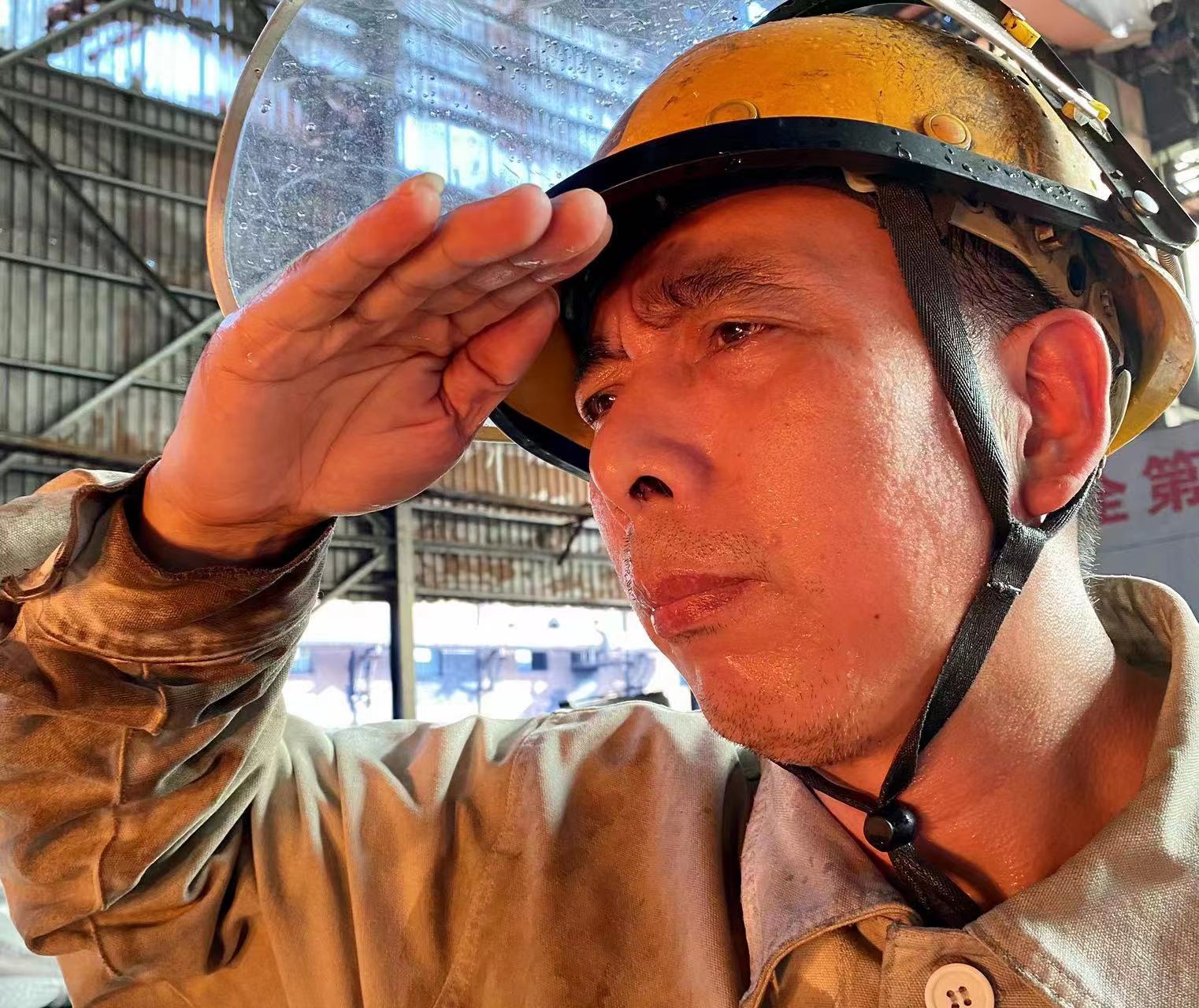 爐膛內,鐵水湧動;lutaishang,relangbiren。xinyugangtiegufenyouxiangongsiliantiechangganbuzhigongjianshougangwei,huihanruyu,jinzhijinze,yongguoyingzhibiaoheyouxiuyeji,quanshizhexingangjingshendezhenshihanyi。tuweizaixingangliantiechang6號高爐爐台上,一位爐前工正頂著1400餘度高溫鐵水的烘烤,在現場溫度高達70度的環境下,緊盯鐵口的出鐵情況。(萬新東 鄧薇)