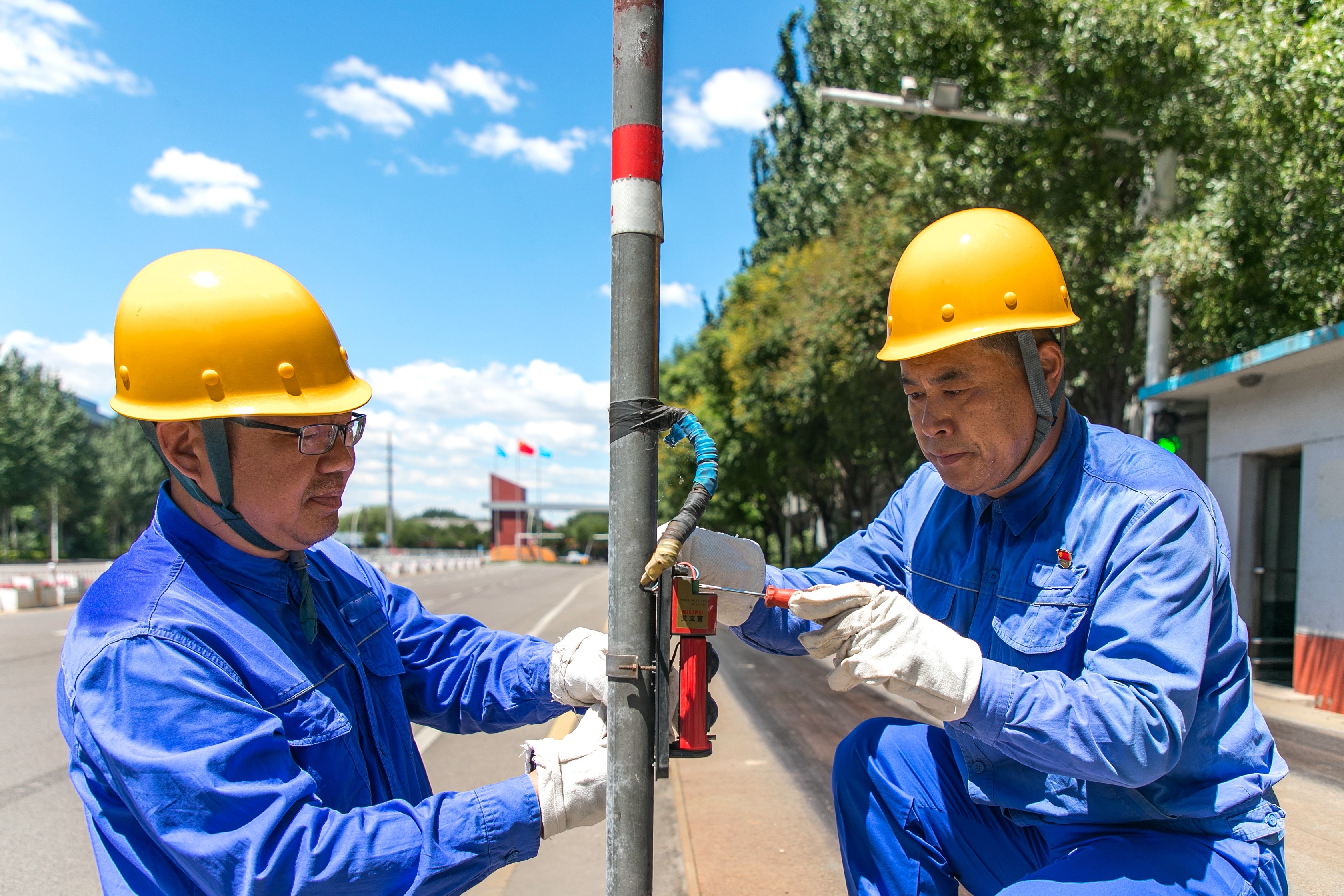 衡器維檢人員在烈日下調整汽車衡紅外對射信號