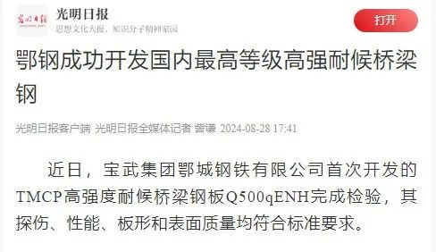 光明日報--《鄂鋼成功開發國內最高等級高強耐候橋梁鋼》