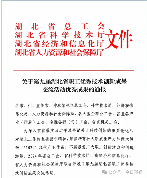 鄂城鋼鐵公司一成果榮獲省優秀技術創新成果三等獎