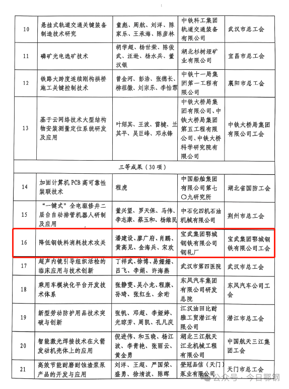 近日,第九屆湖北省職工優秀技術創新成果獲獎名單公布,由鄂城鋼鐵公司工會報送的《降低鋼鐵料消耗技術攻關》獲得優秀成果三等獎。
