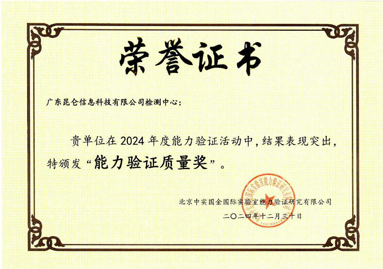 近日,廣東昆侖信息科技有限公司檢測中心榮獲北京中實國金國際實驗室能力驗證研究有限公司(簡稱:中實國金)頒發的2024年度“能力驗證質量獎”,標誌著寶武集團中南股份檢測分析能力和水平在國內鋼鐵企業中處於領先地位。