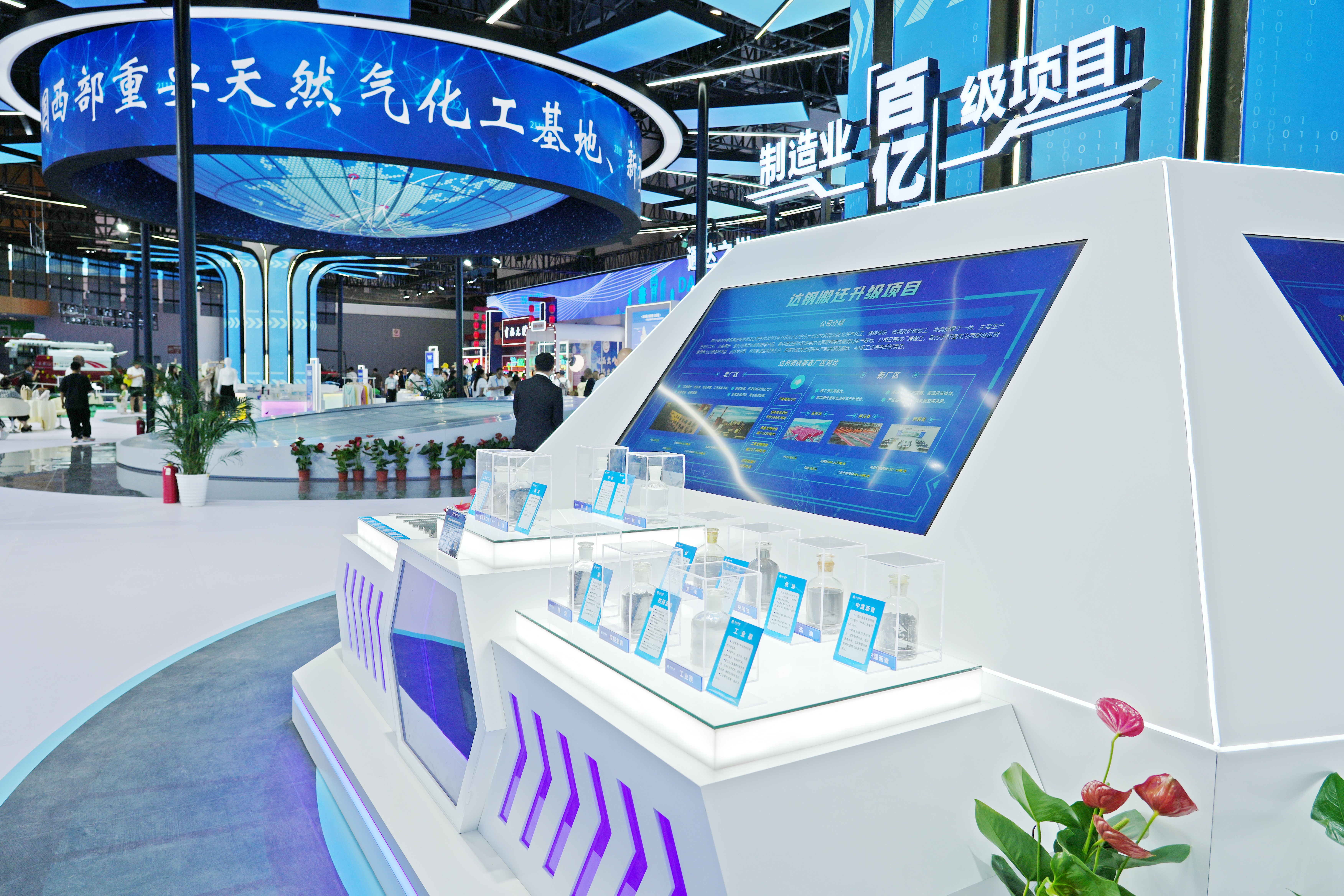 走進方大達鋼展區,“製造業百億級項目”字眼十分醒目,藍白相映的展台很有創新之範。此次亮相西博會,方大達鋼展示了12mm至50mm的含釩高強度抗震鋼筋、工業萘、甲醇、五氧化二釩及純苯等核心產品。同時,重點呈現了搬遷升級項目的產業規劃與技術成果。