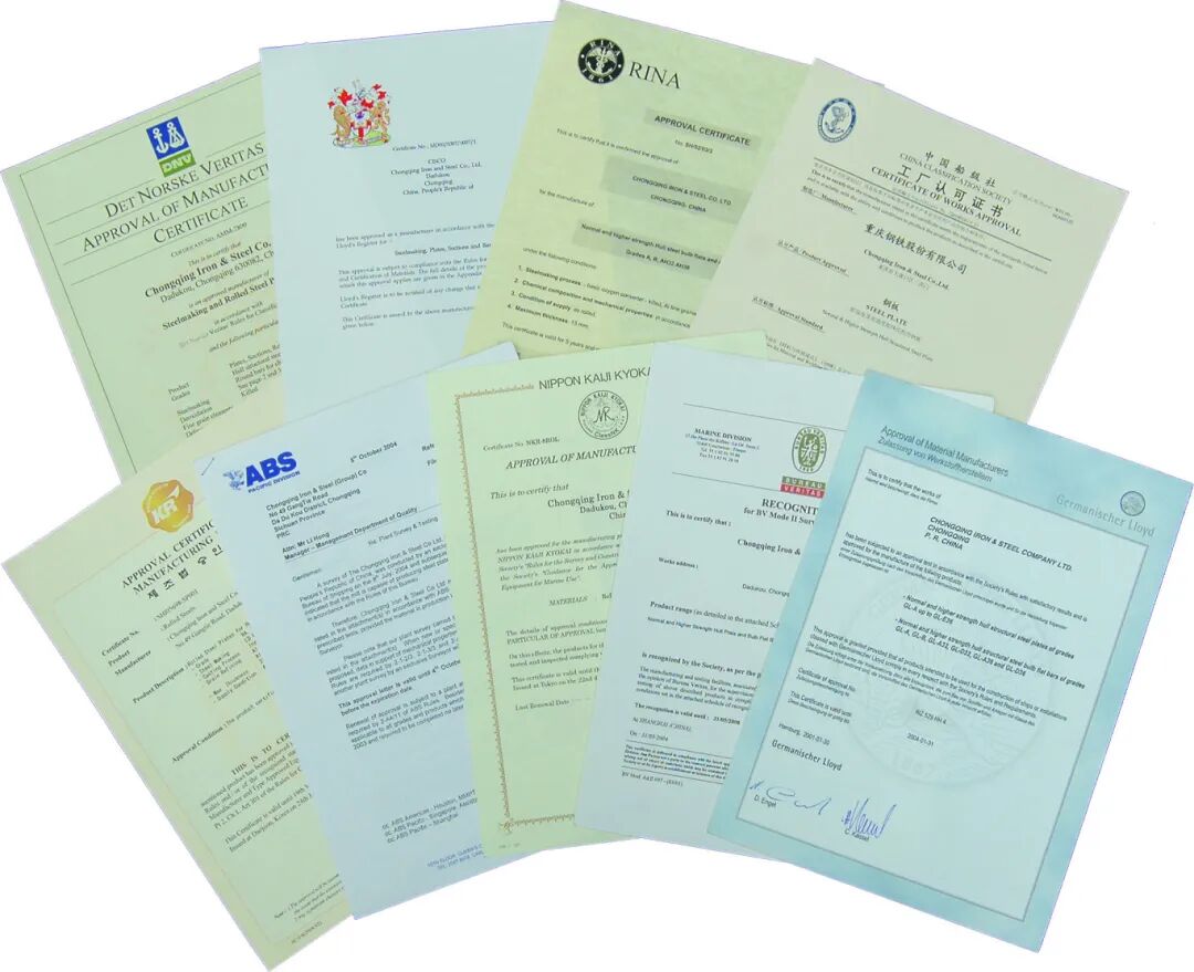 1982年2月17日,英國勞氏船級社(LR)代表高級驗船師石井千秋來重鋼,對重鋼生產的5-25毫米A、B、C、D級造船用鋼板進行鑒定後表示滿意,並於6月25日寄來簽證認可書。此後,重鋼在英國船級社認證上持續發力,1990年11月,重鋼生產的船用鍋爐鋼板410級和船用容器板490級通過英國船級社認證。1996年3月26日,重鋼首次按英國勞埃德船級社規範生產的高強度船板58批900餘噸通過LR驗船師現場檢驗。