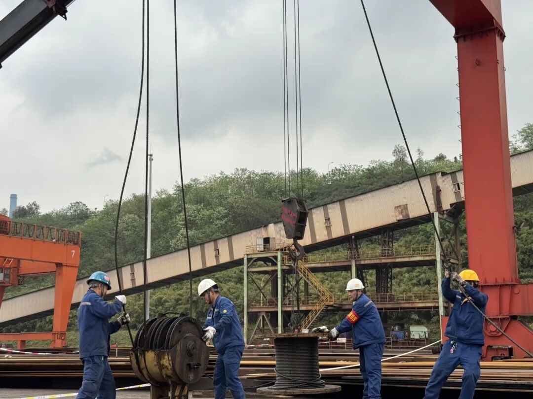 今年四月,一場嚴峻考驗驟然來臨。碼頭庫2號行車主起升鋼絲繩突發嚴重斷絲變形,緊急萬分!機械檢修班迅速響應,成立三個小組進行處理:高空組利用自製“重力引導滑輪”平穩拆除鋼絲繩;地麵組操縱自研“萬向定位穿繩器”,如精密釣竿牽引新繩穿越層層滑輪;卷筒側團隊同步張緊校驗。對講機指令交錯,高空與地麵高效協同,僅6小時,成功完成鋼絲繩更換,較傳統模式搶回4小時黃金生產時間!