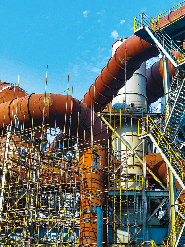 圖為施工人員搶抓燒結機機頭布袋除塵保溫層安裝進度。