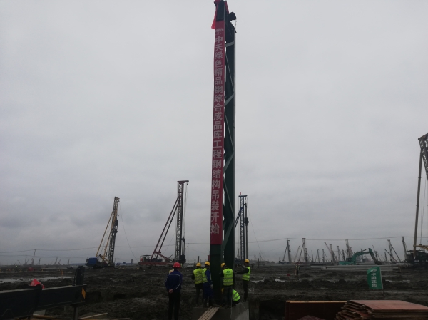 為克服風雨天氣和惡劣路況帶來的不利影響,確保本次吊裝安全、高效、順利完成,項目部提前謀劃,周密部署:吊裝前組織所有施工人員進行詳細的安全技術交底,從現場施工安全、質量驗收、起(qi)重(zhong)機(ji)械(xie)設(she)備(bei)安(an)裝(zhuang)等(deng)方(fang)麵(mian),明(ming)確(que)崗(gang)位(wei)職(zhi)責(ze),細(xi)化(hua)責(ze)任(ren)分(fen)工(gong)。同(tong)時(shi),還(hai)安(an)排(pai)了(le)管(guan)理(li)人(ren)員(yuan)實(shi)行(xing)吊(diao)裝(zhuang)作(zuo)業(ye)全(quan)過(guo)程(cheng)監(jian)督(du),指(zhi)導(dao)施(shi)工(gong)人(ren)員(yuan)一(yi)次(ci)安(an)裝(zhuang)就(jiu)位(wei)。本(ben)次(ci)吊(diao)裝(zhuang)的(de)鋼(gang)結(jie)構(gou)件(jian)為(wei)成(cheng)品(pin)庫(ku)廠(chang)房(fang)鋼(gang)柱(zhu),長(chang)17.49米,寬2.25米,重達6噸,采用80噸輪胎式汽車吊進行吊裝,隨著現場負責人一聲令下,項目作業人員檢查吊具、掛鉤、起吊、落位一氣嗬成,首件鋼結構精準安裝到位,正式拉開了綜合成品庫項目廠房主體鋼結構安裝的序幕。