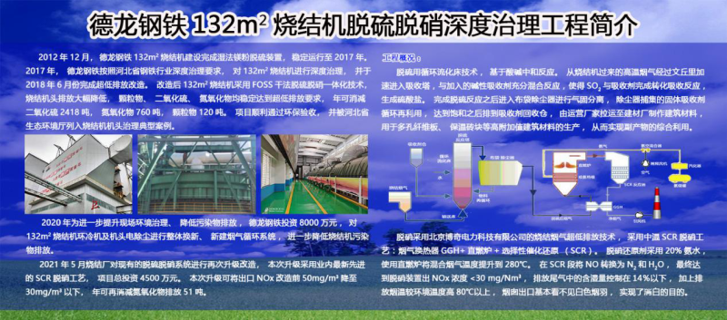 德龍132m2燒結機於2017年6月份提前國家要求兩年實現超低排放改造,並成為國家排放標準製定的參考。被河北省生態環境廳列入燒結機機頭治理典型案例。2020年,公司投資8000萬元對132m2燒結機環冷機及機頭電除塵進行整體換新、新建煙氣循環係統,進一步降低燒結機汙染物排放。