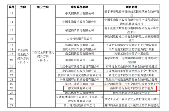 近日,國家工信部完成2021年新一代信息技術與製造業融合發展試點示範名單公示。經企業自主申報、地方推薦及專家評審等環節,全國遴選出工業信息安全能力提升方向31個(其中:工控安全防護能力提升方向18 個)示範單位。德龍鋼鐵依托自身在工業控製領域的沉澱和新一代信息技術的全麵融合,“麵向冶金行業的工控安全防護”項目成功入圍,標誌著企業工控能力及成效建設獲得國家與行業的認可。
