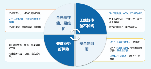 第一,高帶寬。光纖鏈路全萬兆,延伸到班組,便於以後隨時擴容網絡;車間部署支持Wi-Fi 6協議的高密AP,提升3倍的容量性能,支持光纖接入,跨過100米的網線限製,可在車間任意點位部署;