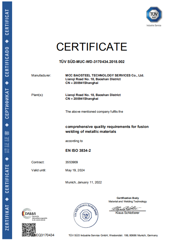 本次EN1090、ISO3834資質複證事宜從2021年5月啟動,經過詢價報價,上會審議,流程審批,合同審批、簽訂,複審準備,專家現場審核,證書下發,前後曆時8個月,實屬不易。資質證書的取得,有效確保了中冶寶鋼歐標鋼結構製作資質的延續,為歐標鋼結構製作項目的洽談和承攬提供條件,也為中冶寶鋼進一步開拓歐盟鋼結構製作市場打下了堅實的基礎。(郝劉超)