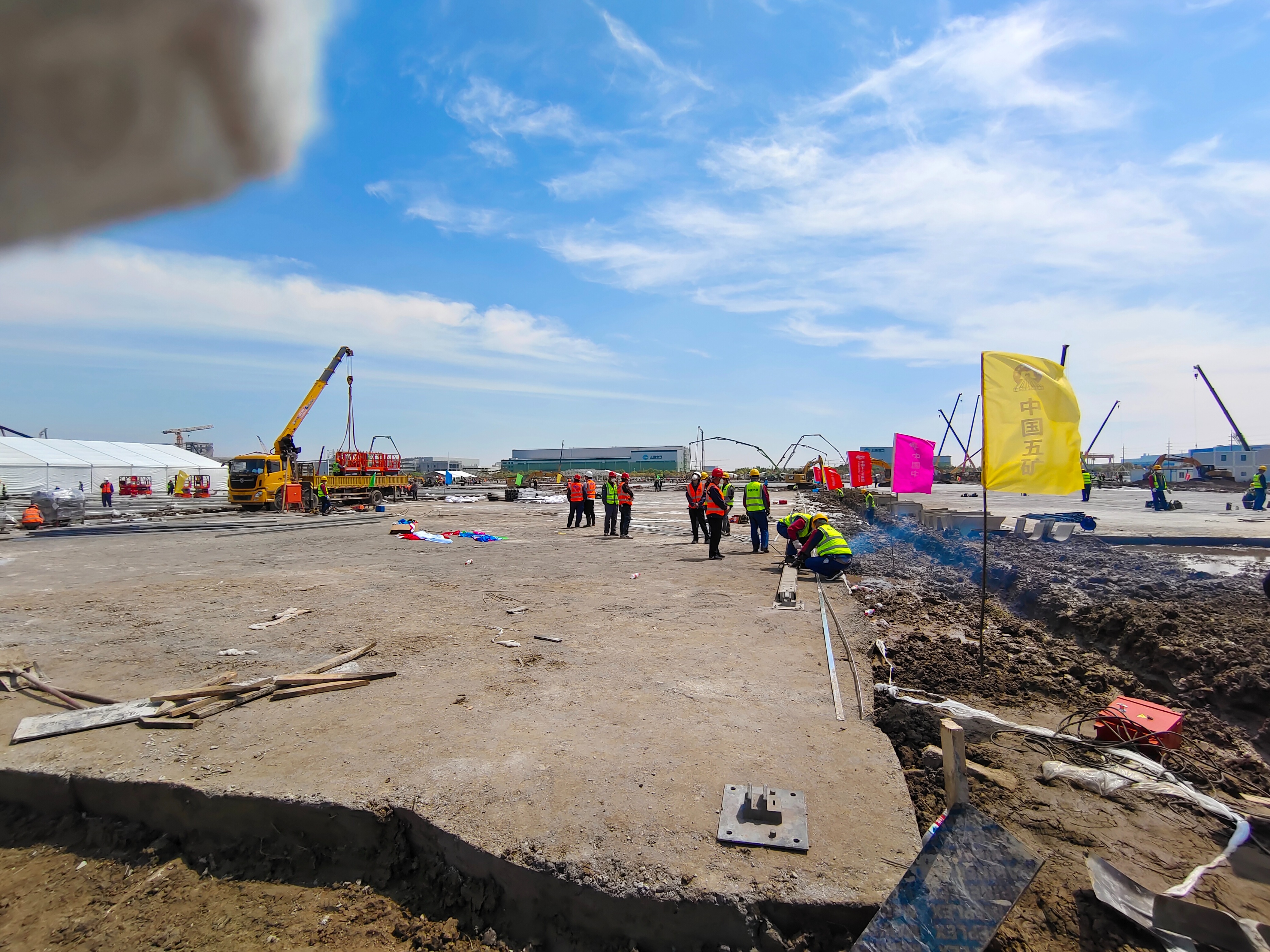 4月13日下午5點,沐著微微的細雨,載著十七冶首批援建上海臨港方艙醫院人員的大巴車,從“詩城”馬鞍山浩浩蕩蕩地奔赴上海。本應淩晨前便抵達目的地的車輛,因為高速堵車的原因,一堵便是9個小時,直到第二天的早上8點半,車輛終於突破堵車的阻礙,抵達上海市園和路——臨港方艙醫院的建設所在地。還沒來得及好好修整,吃完早飯的大家迅速更換裝備,在明確了分工、細化了任務後,火速前往現場投入土地圍擋作業,混凝土攪拌及澆築、施工材料進場及加工以及各類後勤保障物品進場等工作也同步開展中。前一天的大雨和大幅降溫,讓現場成為一個“大泥塘”,但工人不顧低溫和泥濘,毅然投入到緊張的地坪模板綁紮和混凝土澆築中,施工大幹之勢一觸即發。