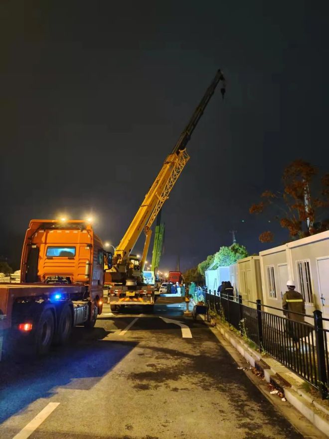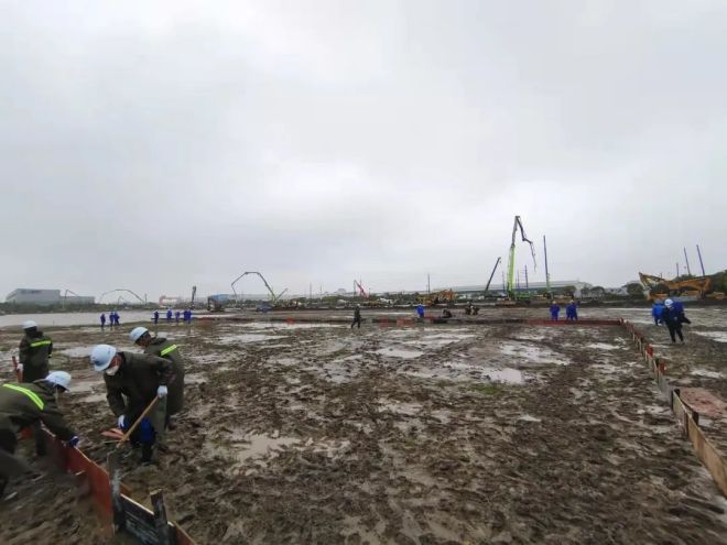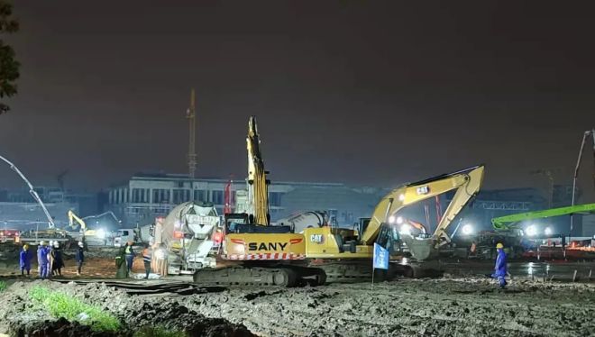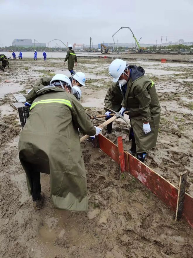 公司以項目管理部副部長吳民、安監部副部長魏寧為代表的黨員骨幹,從馬鞍山本部陸續集結100餘人作業力量,全體完成核酸檢測後於4月13日下午17時增援上海。次日上午8:30分左右,十七冶首批援建隊伍達到現場,旋即成立黨員突擊隊、黨員先鋒隊,勇擔全體建設者的“主心骨”。工作組立即部署工作任務,馬不停蹄投入施工。截止4月14日晚,現場累計投入施工力量300餘人,推土機、壓路機、挖掘機、吊車、汽車泵等施工機械44台,運輸車輛20餘台,混凝土攪拌車數十輛。機器沸騰轟鳴、人流穿梭不息,還有沙啞著嗓子互相鼓勁聲,正不斷注入“靜態”下的上海“動能”。建設者們不畏艱險、不知疲倦,與疫魔爭分奪秒,澆築混凝土1000立方米,土地平整27000平方米。為了給建成交付多爭取一秒時間,冒雨入場300餘人的“急行軍”搶先施工。當天夜裏,周金龍副總經理帶領工作組連夜優化施工組織,製定應對現場積水、加快作業麵趕工措施。