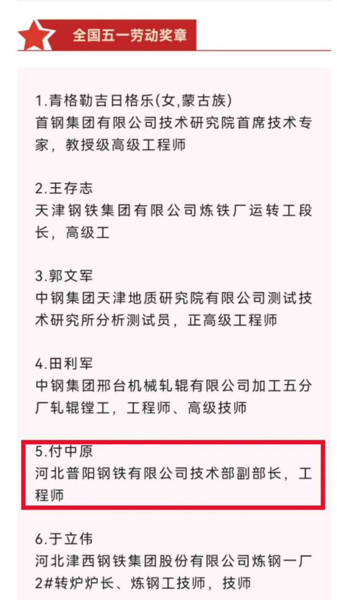 從《公示》中獲悉,普陽鋼鐵集團技術部副部長付中原榮獲全國五一勞動獎章。