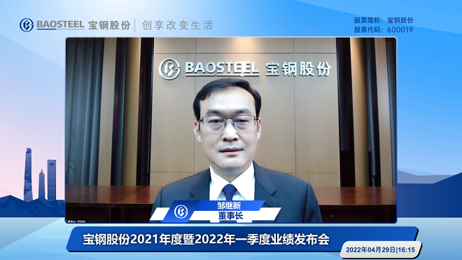 4月29日,寶鋼股份發布了2021年度暨2022年一季度業績,並在當日召開了中英雙語業績說明會。董事長鄒繼新,董事、總經理盛更紅,獨立董事陸雄文,財務總監兼董事會秘書王娟、寶鋼股份首席研究員王利出席會議。