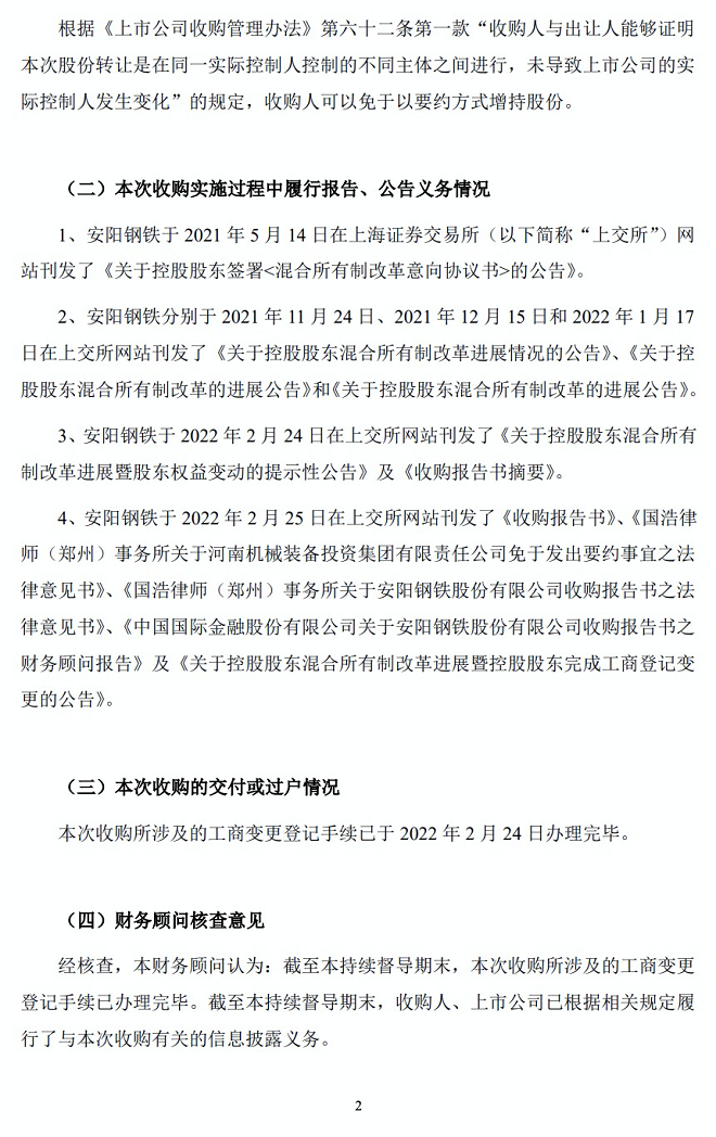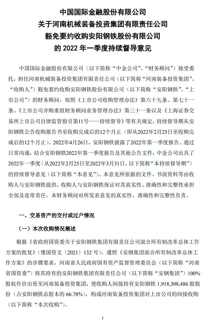 5月10日,安陽鋼鐵發布了《中國國際金融股份有限公司關於河南機械裝備投資集團有限責任公司豁免要約收購安陽鋼鐵股份有限公司的2022年一季度持續督導意見》公告(以下簡稱公告)。