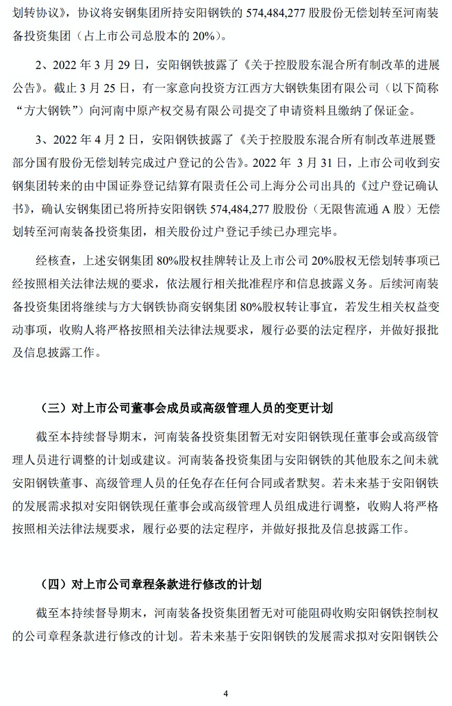 安陽鋼鐵回複了控股股東混合所有製改革的最新進展:公(gong)司(si)控(kong)股(gu)股(gu)東(dong)安(an)陽(yang)鋼(gang)鐵(tie)集(ji)團(tuan)有(you)限(xian)責(ze)任(ren)公(gong)司(si)混(hun)合(he)所(suo)有(you)製(zhi)改(gai)革(ge)目(mu)前(qian)正(zheng)處(chu)於(yu)意(yi)向(xiang)投(tou)資(zi)方(fang)江(jiang)西(xi)方(fang)大(da)鋼(gang)鐵(tie)集(ji)團(tuan)有(you)限(xian)公(gong)司(si)與(yu)轉(zhuan)讓(rang)方(fang)公(gong)司(si)間(jian)接(jie)控(kong)股(gu)股(gu)東(dong)河(he)南(nan)機(ji)械(xie)裝(zhuang)備(bei)投(tou)資(zi)集(ji)團(tuan)有(you)限(xian)責(ze)任(ren)公(gong)司(si)等(deng)相(xiang)關(guan)方(fang)充(chong)分(fen)協(xie)商(shang)階(jie)段(duan),xieshangjieguodengshixiangcunzaibuquedingxing。gongsijiangyangeanzhaoyouguanfalvfaguideguidingheyaoqiu,cuqingxiangguanfangjishigaozhiangangjituanhunhesuoyouzhigaigejinzhanqingkuang,jishitishifengxian,lvxingxinxipiluyiwu,xiexieguanzhu!