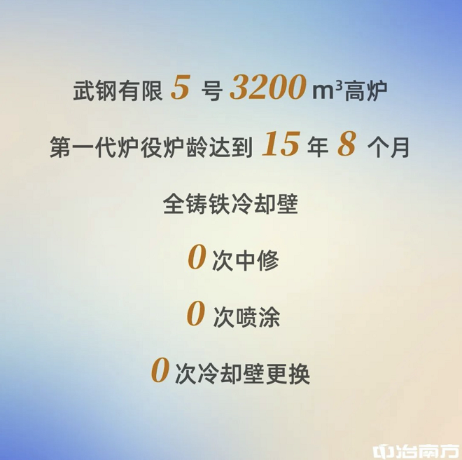中冶南方服務了武鋼全部高爐的設計與建設,其中武鋼有限6號、7號3200m³高爐及8號4100m³高爐在2004年~2009年相繼投產,各項生產指標、高爐壽命均在我國同級別及以上高爐中處於領先水平,使武鋼有限成為目前國內唯一全廠所有高爐均實現高效長壽的鋼企。