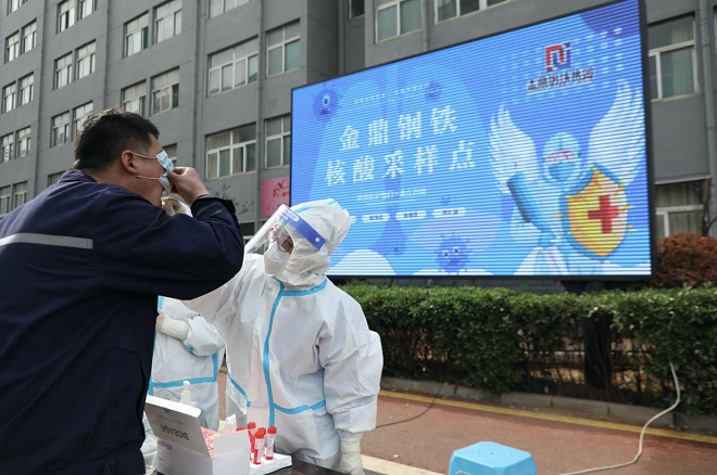 4月15日淩晨0時30分fen,金jin鼎ding鋼gang鐵tie集ji團tuan疫yi情qing防fang控kong領ling導dao小xiao組zu辦ban公gong室shi依yi舊jiu燈deng火huo通tong明ming,有you條tiao不bu紊wen地di安an排pai部bu署shu明ming天tian一yi早zao的de全quan員yuan核he酸suan工gong作zuo。疫yi情qing就jiu是shi命ming令ling,防fang控kong就jiu是shi責ze任ren。說shuo時shi遲chi,那na時shi快kuai,培pei訓xun使shi用yong核he酸suan檢jian測ce錄lu入ru係xi統tong、現場布置多個核酸采樣點、協調領取核酸采樣物資、布置鋪設網線、打印電子健康碼......這注定又是一個不眠夜,有人開玩笑地說“真是比過年還要熱鬧啊”。大家各司其職,全民皆兵,為了盡快開展檢測工作緊鑼密鼓地忙碌著,一場全員備戰核酸檢測戰役正在這座鋼城悄然打響。
