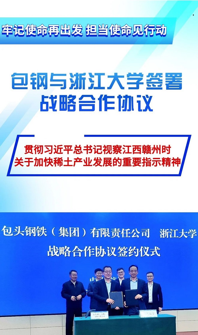 5月20日,在紀念習近平總書記視察江西贛州三周年、全國稀土行業重溫習近平總書記重要指示精神之際,包鋼(集團)公司、浙zhe江jiang大da學xue戰zhan略lve合he作zuo協xie議yi簽qian約yue儀yi式shi在zai浙zhe江jiang大da學xue舉ju行xing。此ci舉ju旨zhi在zai深shen入ru貫guan徹che落luo實shi總zong書shu記ji重zhong要yao指zhi示shi精jing神shen,構gou建jian產chan學xue研yan用yong深shen度du融rong合he的de創chuang新xin聯lian合he體ti,引yin領ling和he推tui動dong我wo國guo稀xi土tu產chan業ye高gao質zhi量liang發fa展zhan。
