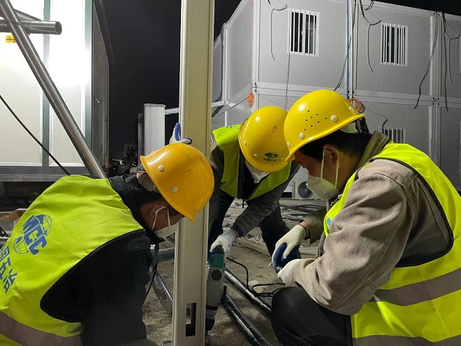 4月13日,應上海地產住房發展有限公司來函商請支援,中國五冶立即成立維保援建隊伍,由朱琛誌帶隊16人連夜趕赴國家會展中心方艙地點,立即投入戰鬥,主要負責在7.1館和8.1館艙內進行150張新增床位的組裝及新增烘洗消一體機設備的安裝及調試,隨後留艙對A、B、C住宿區的電力、給排水進行日常的維保檢修。4月21日晚,曆經8天在汙染區和緩衝區內持續高強度鏖戰後,按時完成任務,交付使用並安全有序撤離,解決了國家會展中心方艙項目的燃眉之急。