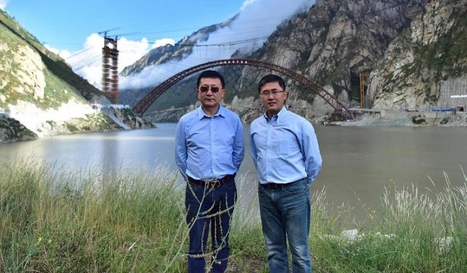 圖一 中國著名橋梁鋼專家中信金屬公司副總經理兼總工程師郭愛民博士(左)和本文作者王厚昕博士在中國耐候鋼橋第一座裏程碑——西藏拉林藏木鐵路耐候鋼橋前留影。