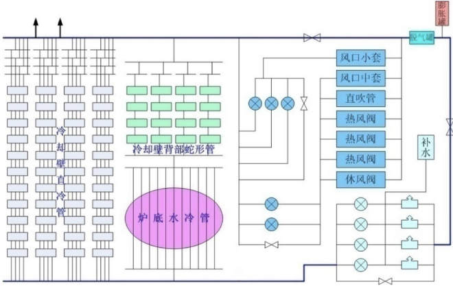 該係統根據高爐內各冷卻設施熱負荷特點和阻損匹配原則,將冷卻壁、爐底水冷係統、風口係統、熱風閥係統等,通過並聯與串聯的整合方式巧妙地合並成一個係統。